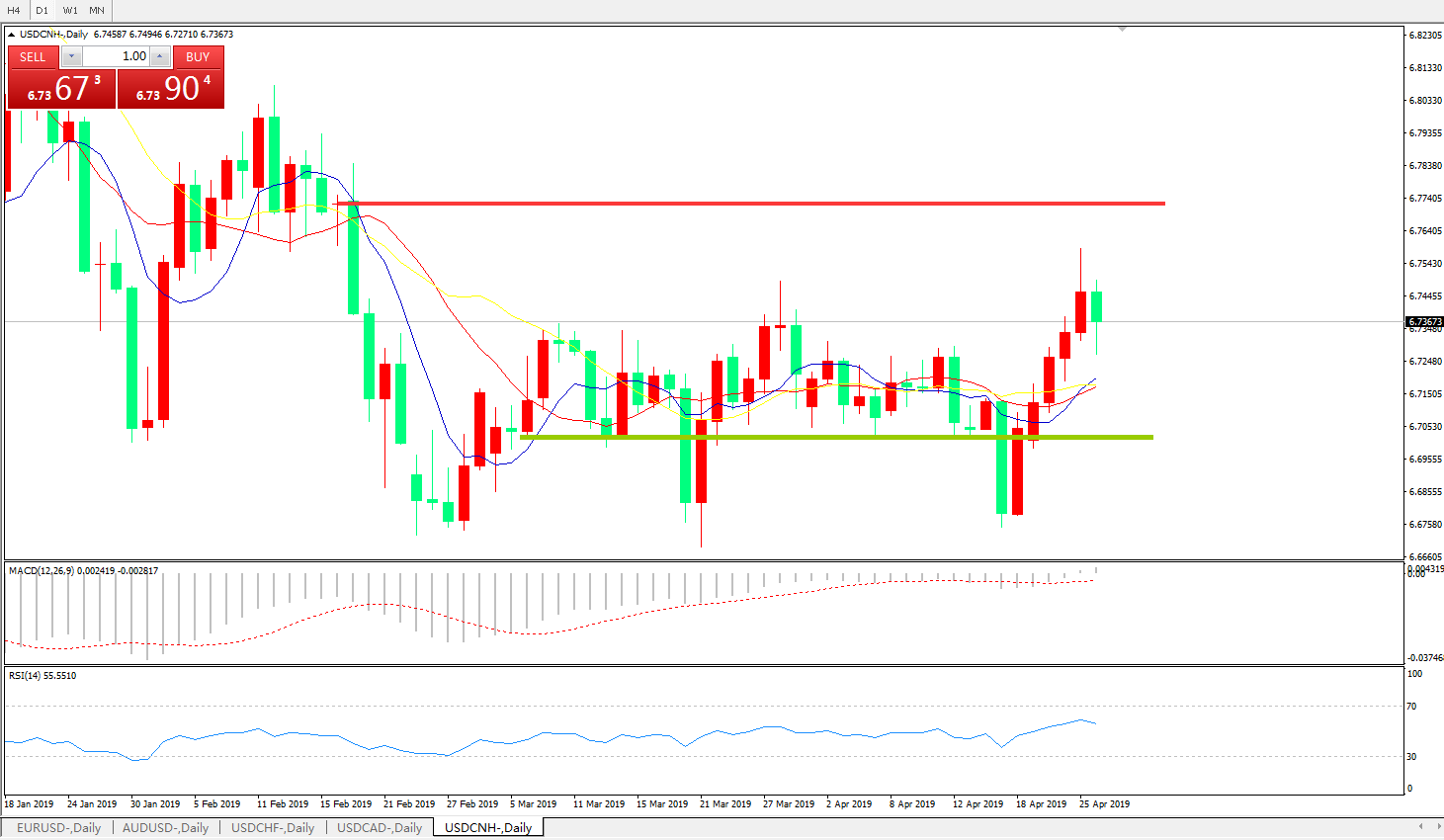 交易策略6.6990之上,看涨,目标价位为6.7845,然后为6.8185