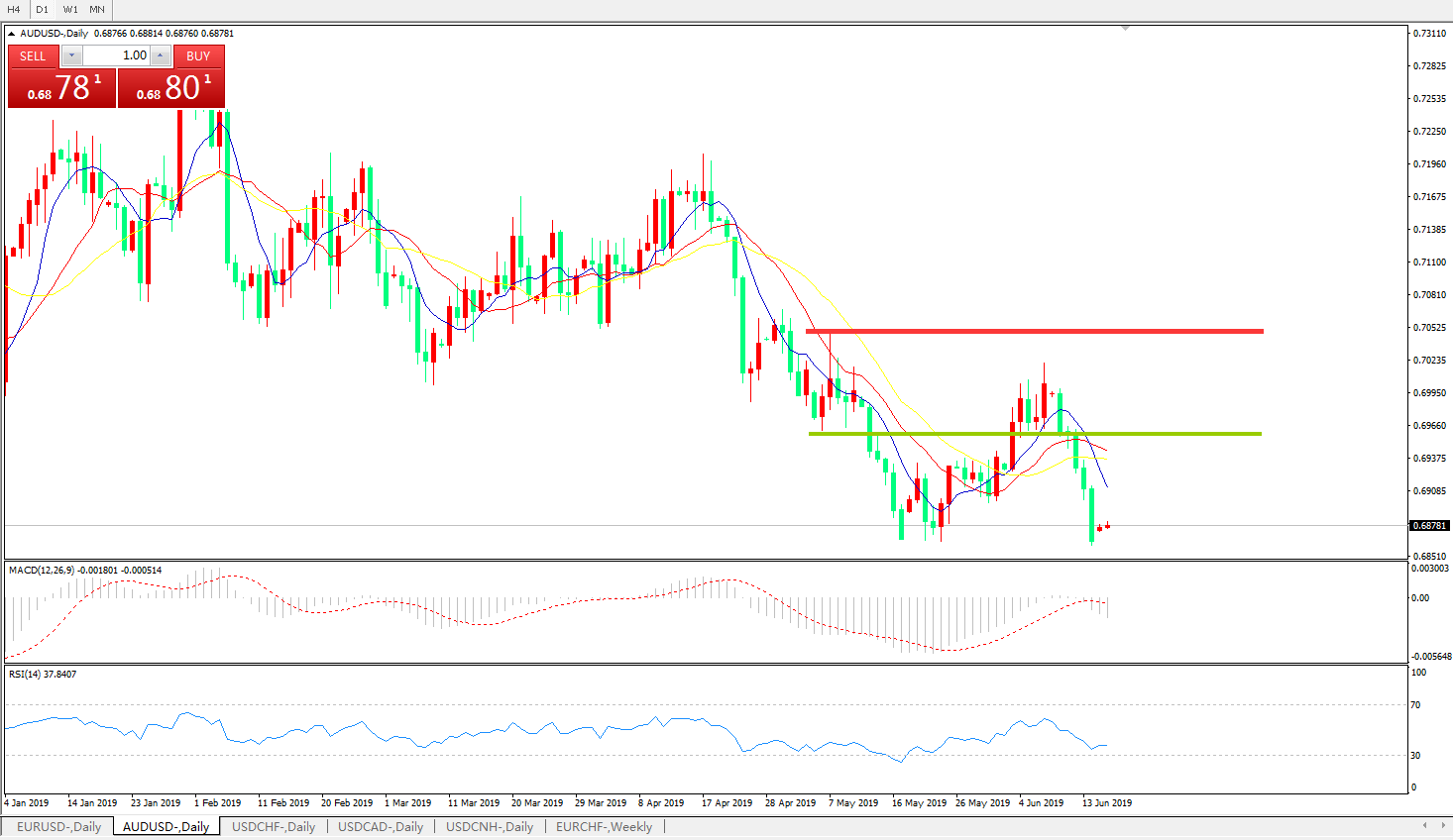 技术面简析:日图均线再度死叉下行,价格持续大幅回落,MACD0轴下方有持续放量,RSI持续走低,预计汇价将继续走低,大概率蒋打破前低下行。