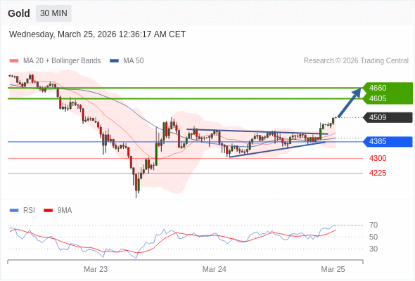 在 4385 之上,看涨,目标价位为 4605 ,然后为 4660 。