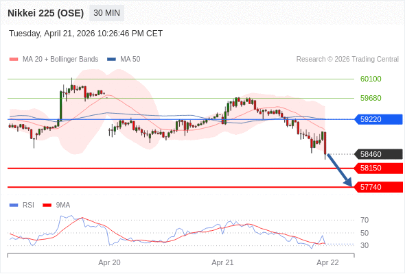 在 59220 之下,看跌,目标价位为 58150 ,然后为 57740 。