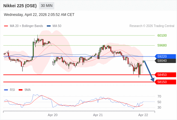 在 59220 之下,看跌,目标价位为 58450 ,然后为 58150 。