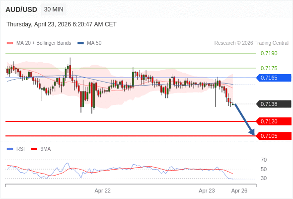 在 0.7165 之下,看跌,目标价位为 0.7120 ,然后为 0.7105 。