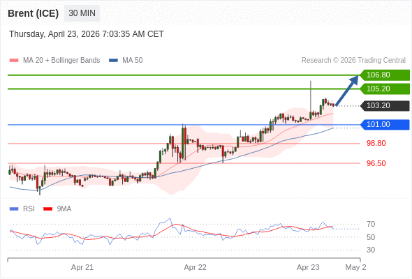 在 101.00 之上,看涨,目标价位为 105.20 ,然后为 106.80 。