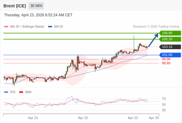 布伦特原油 (ICE) (M6) 当日内: 在101.00之上,看涨。