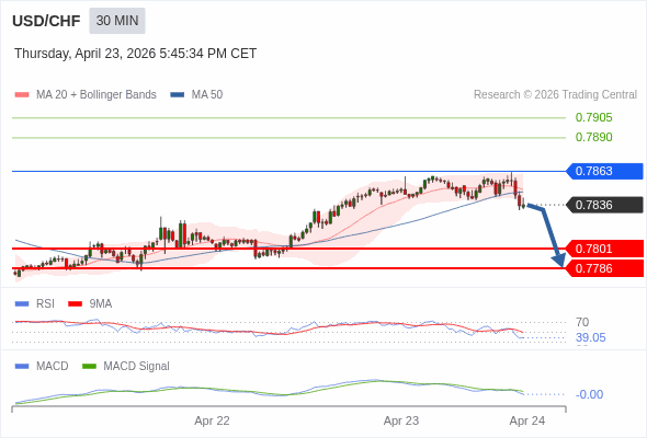 美元/瑞郎 当日内 : 看跌,在 0.7863 之下。