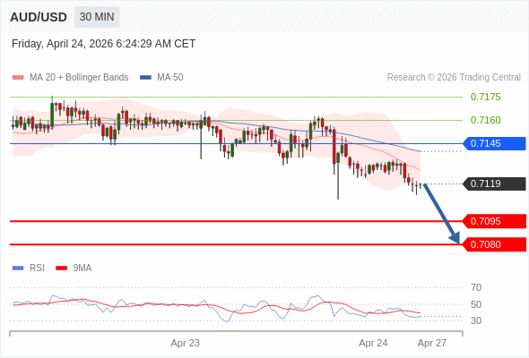 在 0.7145 之下,看跌,目标价位为 0.7095 ,然后为 0.7080 。