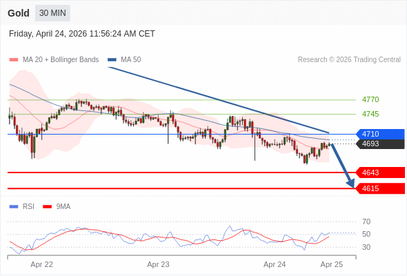 在 4710 之下,看跌,目标价位为 4643 ,然后为 4615 。