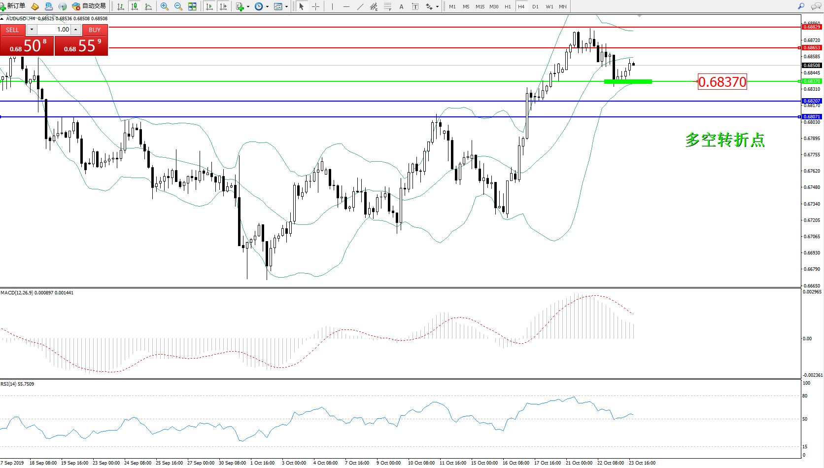 交易策略:0.68370上方看涨,目标0.68653、0.68829