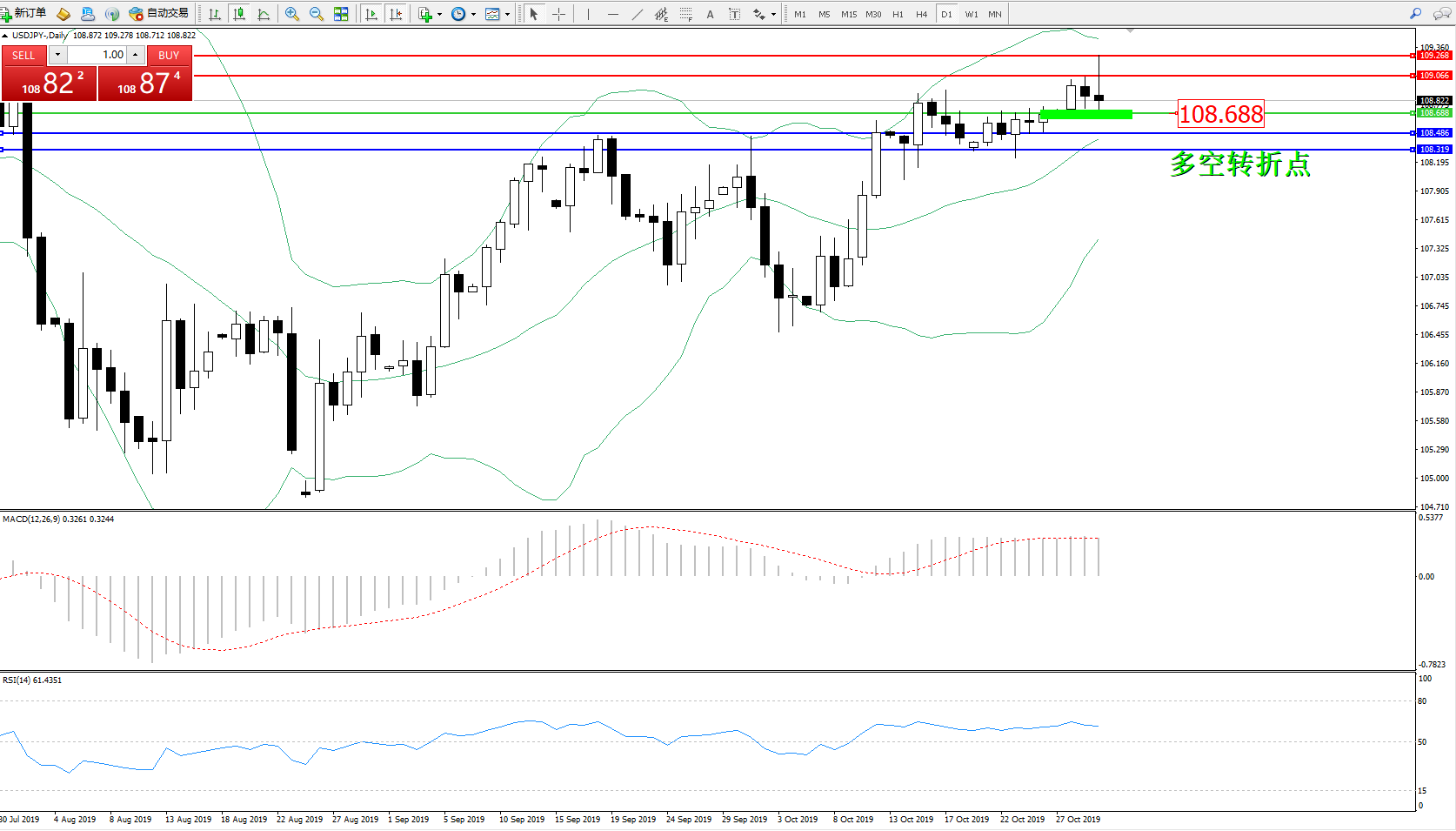 美元兑日元现报108.90,涨0.05%;据日经新闻:日本央行正考虑在10月31日的利率决议中修改前瞻性指引,以更明确地暗示未来降息的可能性。美国三季度GDP同比增长1.9%,略低于二季度的2.0%,但明显强于市场观察者之前给出的1.6%这一悲观预测。这显示美国经济在旺盛消费活动的带动下仍保持韧性,缓冲了贸易和投资领域所遭遇的冲击。因此,经济并未录得预期中严重的失速;美联储宣布降息25个基点至1.5%-1.75%,为年内第三次降息,符合市场预期;在会后的政策声明中,美联储删除了“采取适当措施”的承诺。