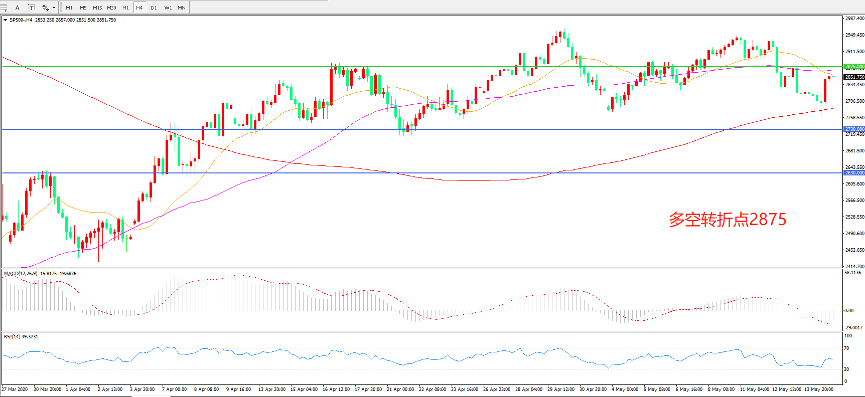 4小时图看,标普长阳拉升,200周期均线成为短期支撑,短期均线成为上方阻力, MACD绿柱减少,RSI指标走平,日内延续震荡概率较大。
