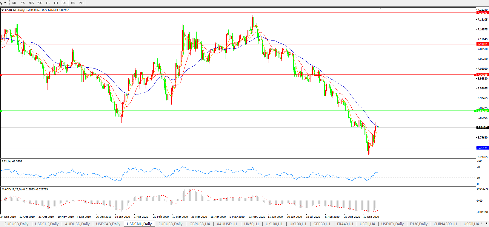 美元兑人民币USDCNH 日线图: