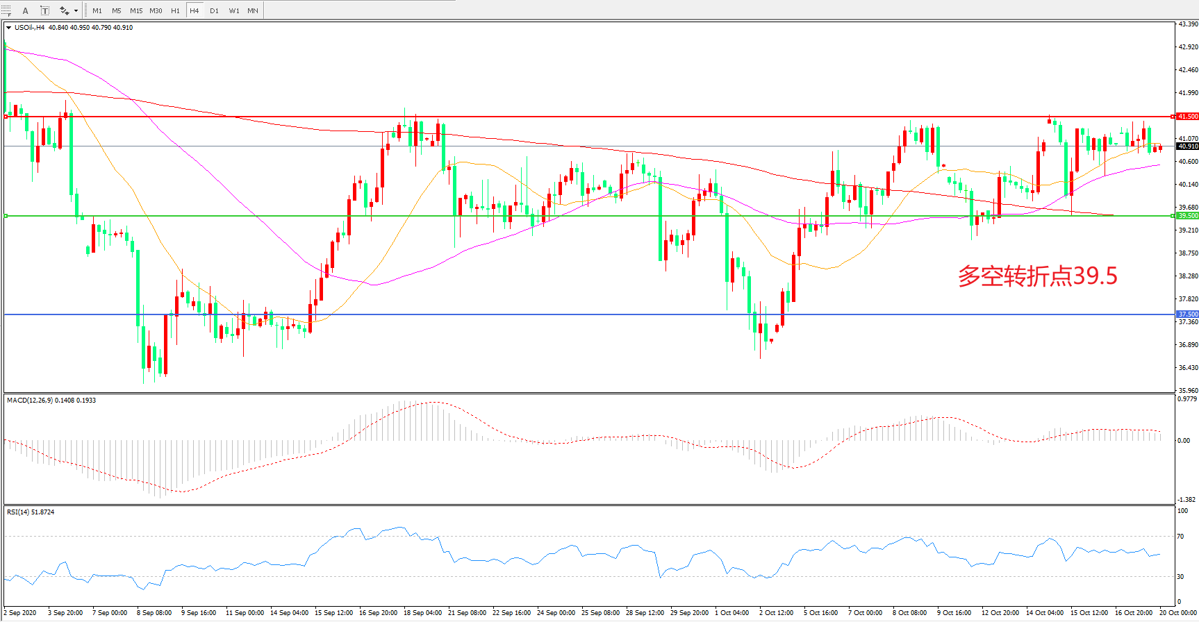 4小时图看,油价延续宽幅震荡,整体表现有所回暖,55均线成为短期支撑,41.5成为上方阻力,MACD红柱增加,RSI指标走平,日内延续震荡概率较大。