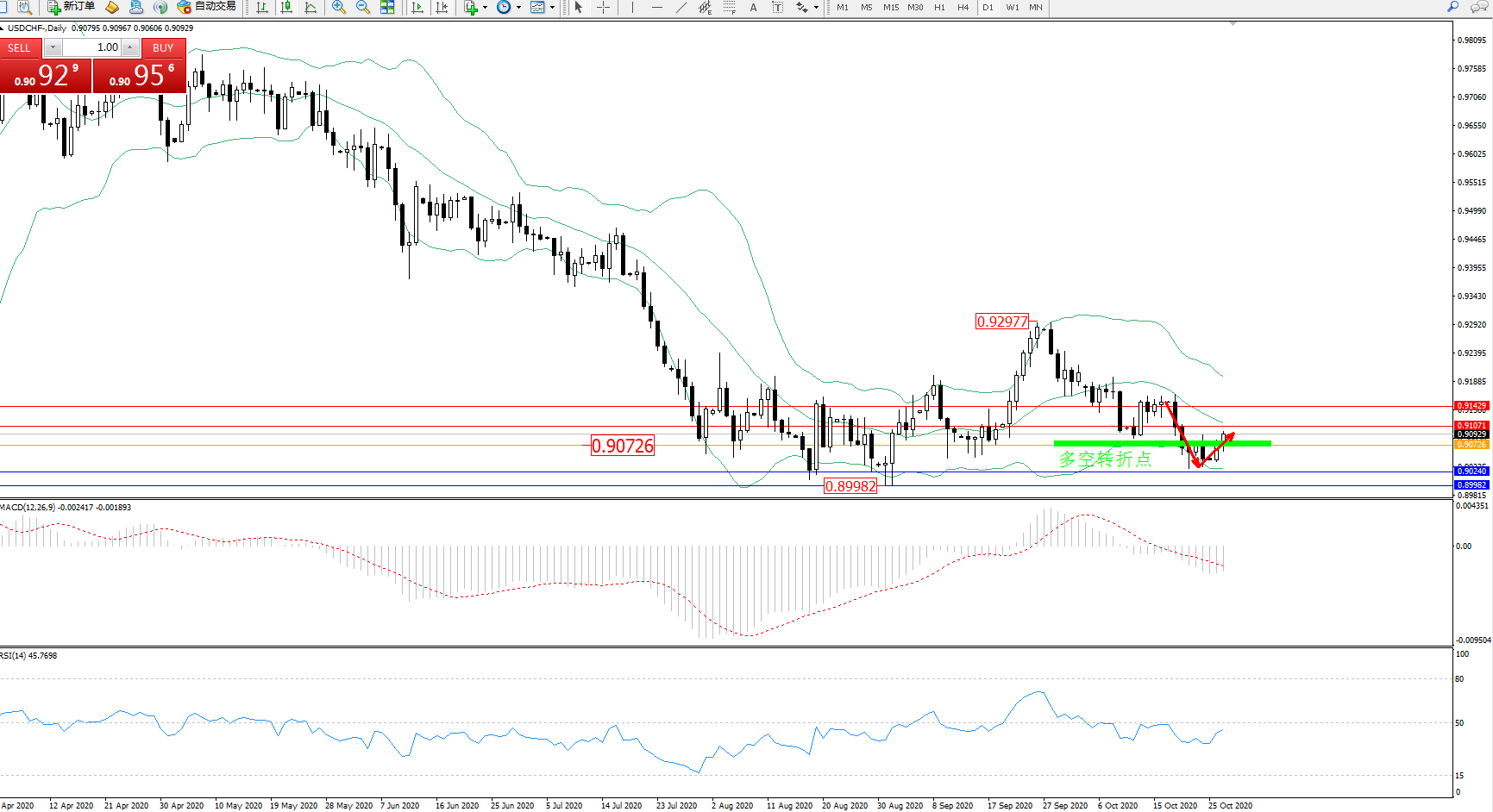 交易策略:0.90726上方看涨,目标0.91071、0.91429