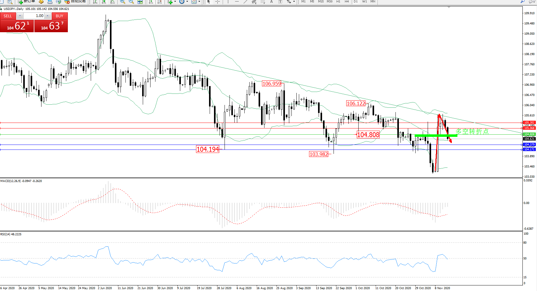 交易策略:104..808下方看跌,目标105.068、105.302