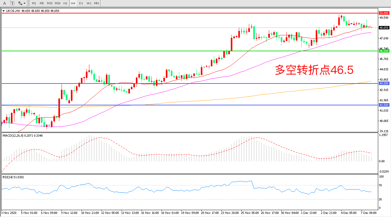 4小时图看,油价延续高位震荡,短期涨势有所回调,55周期均线成为短期支撑,50美元成为中期阻力,MACD红柱减少,RSI指标走平,日内延续震荡概率较大。