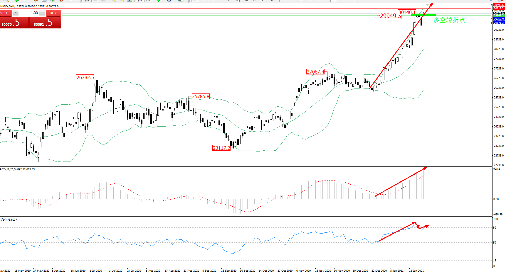 技术点评:多头动力延续布林带指标通道上轨附近持续震荡上扬态势良好,高位抵达30140位置后遇阻出现短暂回撤下行走势,然多头动力并未有止步迹象,多头再度发力,有继续破新高态势,布林带指标呈张口走势后开始有向上收口迹象,MACD指标处于多头区域持续震荡上扬态势良好,RSI指标处于多头区域超买区80均衡线附近震荡后开始短暂回撤;