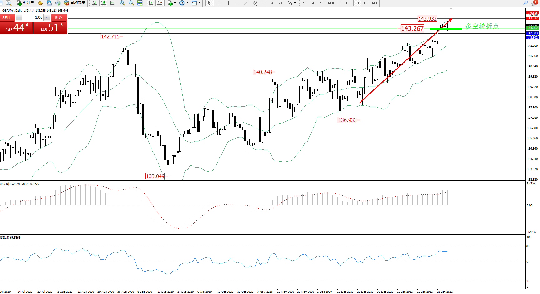 交易策略:143.267上方看涨,目标143.932、144.318