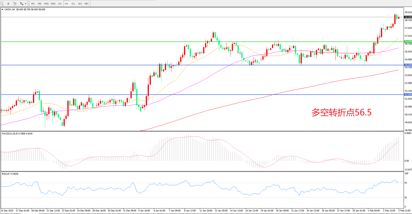 周三(2月3日),美国能源信息署公布的当周美国原油库存降幅不及预期,但库欣地区库存降至3月以来最低,炼油厂产能利用率上升0.6%,布伦特原油延续强势表现,大幅上行后收报58.60美元/桶。当前市场上的乐观情绪让原油价格在没有像样回调的情况下继续向上推进,以盘整的方式消化压力,继而以当前平台为起点往上行,短期表现十分强势。