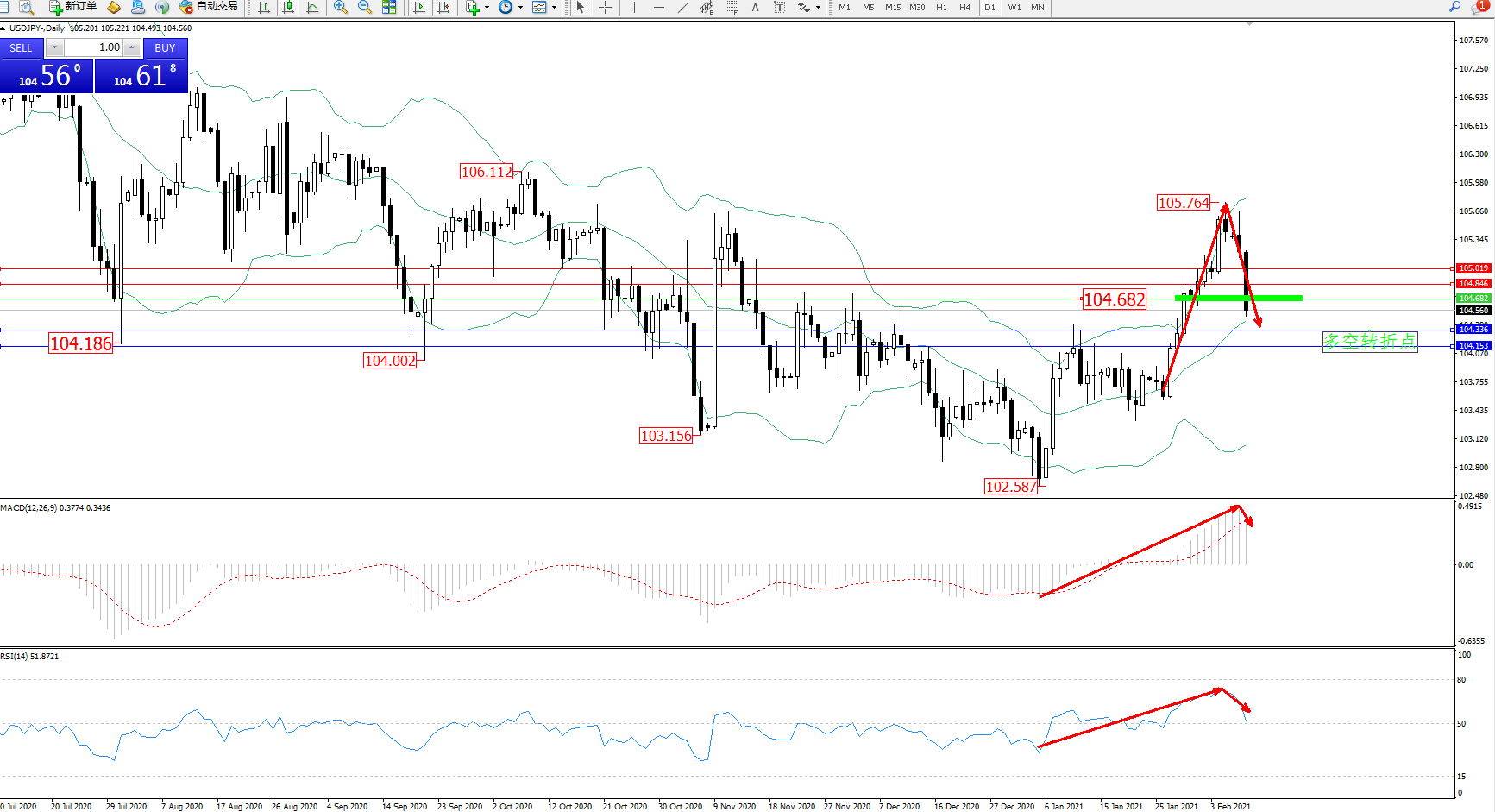 美元兑日圆高位急速下挫至104.560附近震荡,日本第四季度GDP数据将于下周公布,去年第三季从战后最大的衰退强劲反弹后,第四季经济增长可能收缩,显示家庭与企业尚未从新冠疫情打击中复苏。在经济活动受限的情况下,消费、尤其是服务业支出,将继续下滑。1-3月消费下滑是不可避免的。1月日本政府宣布实施的紧急状态令消费蒙受更多痛苦,引人忧心经济再下滑的话恐将使日本经济再次回到通缩。日本央行1月的预期显示截至3月的全年经济可能萎缩5.6%,凸显出疫情对脆弱经济的严重影响。经济增长停滞甚至收缩的前景为日元中长期带来转跌风险,虽然本周美元走弱,美元兑日元持续下跌,然而多头仍在等待下周日本第四季度GDP数据带来转机。
