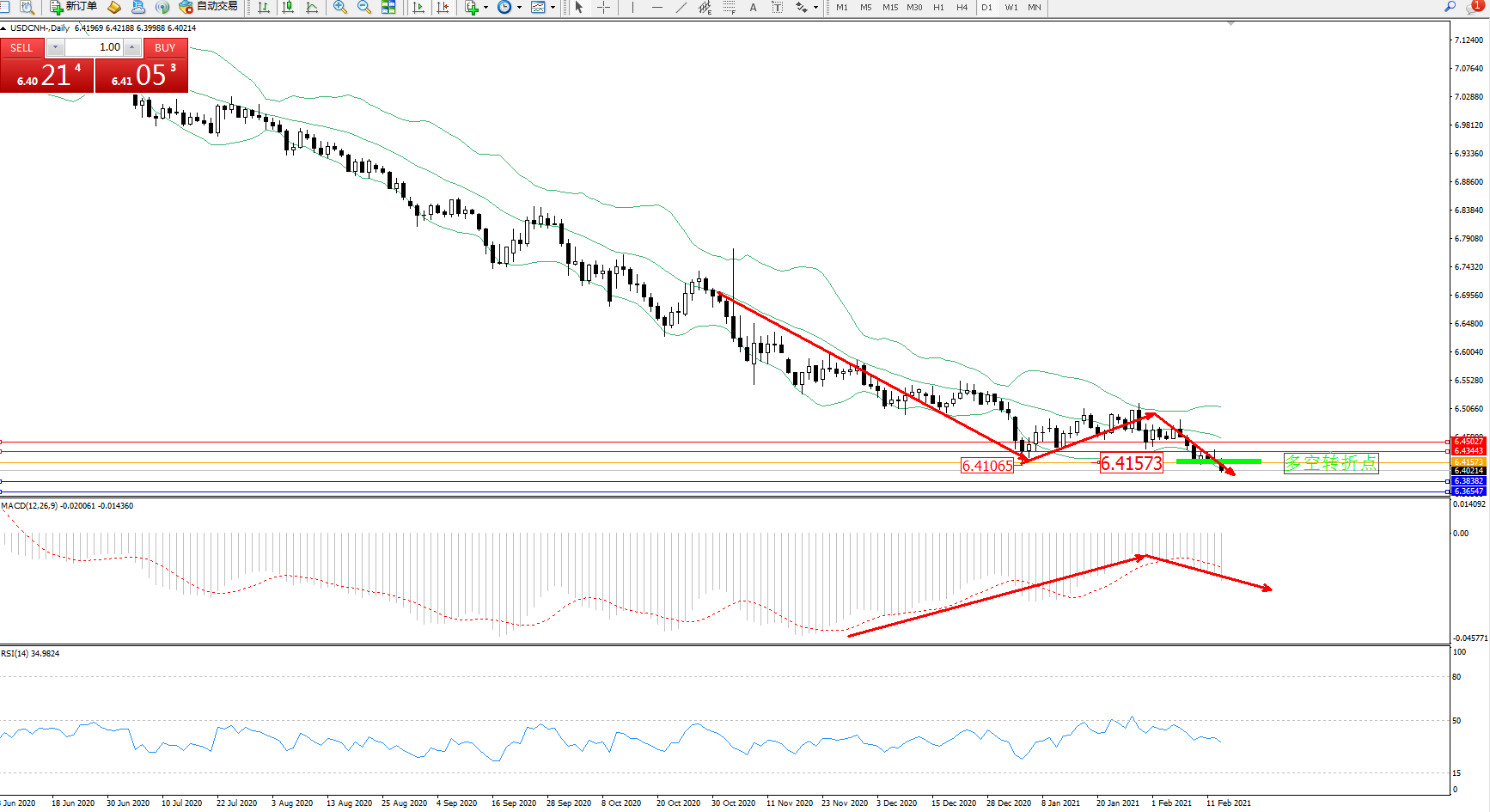 交易策略:6.41573下方看跌,目标6.38382、6.36547