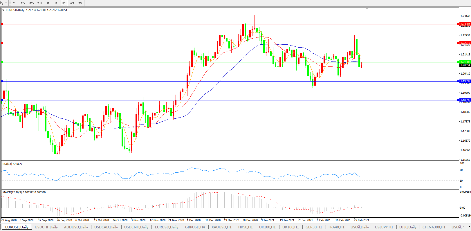 交易策略:1.2100下方看跌,目标1.2000、1.1900