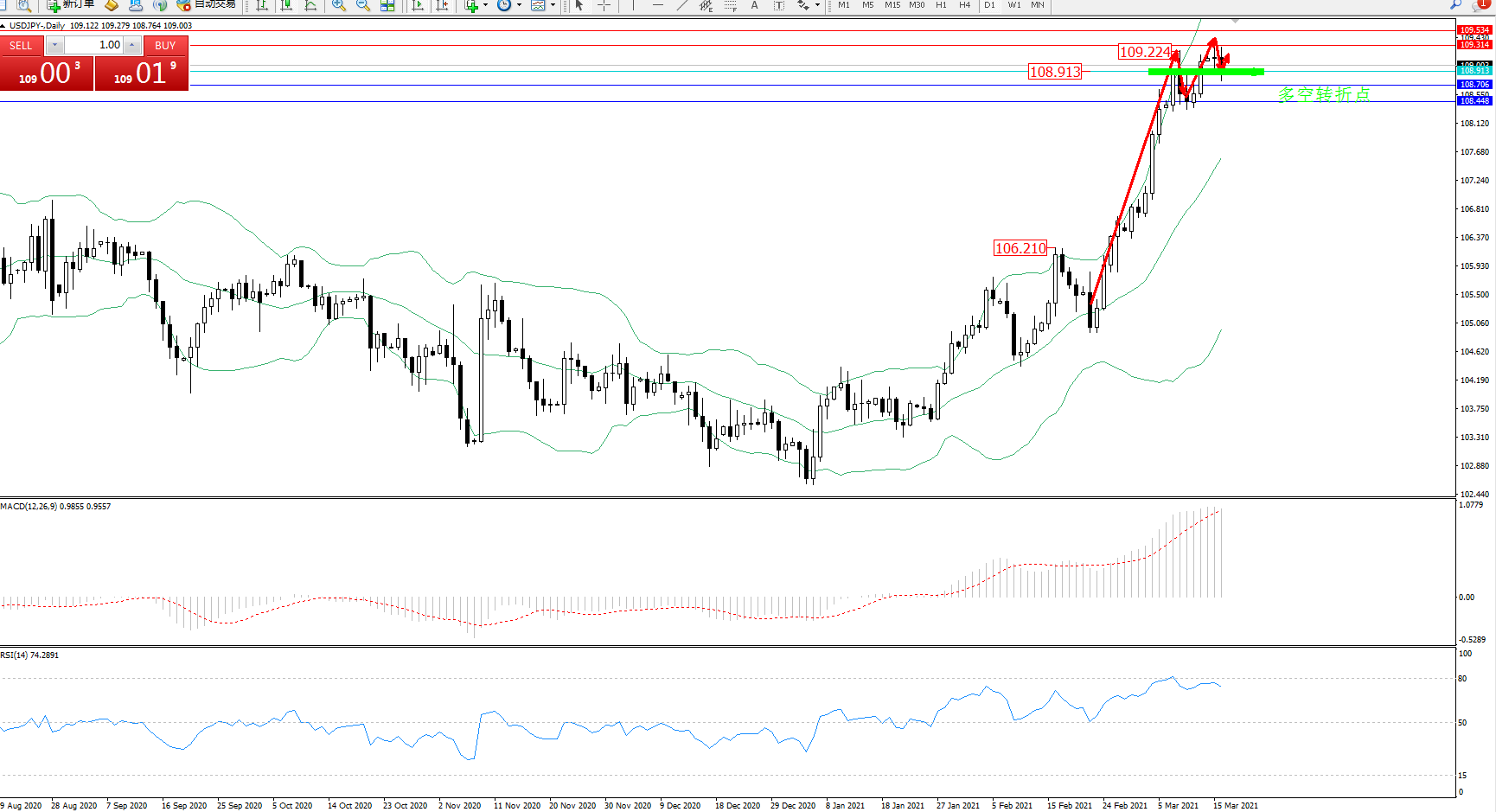 技术点评:多头动力延续布林带指标通道上轨附近节点持续震荡上扬,高位纠结于109.224附近节点后持续有拉升上行态势,之前高位破位后维持震荡,短期或继续高位整理,布林带指标呈张口走势后不断有上移迹象,且有收口态势,MACD指标处于多头区域高位不断震荡上移,RSI指标处于80均衡线下侧弱势徘徊中;
