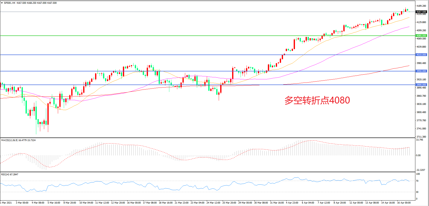 上周,美国3月新屋开工年化户数创将近十五年新高,美国密歇根大学4月消费者信心指数初值创去年3月疫情爆发以来新高。标普500在全球经济复苏的乐观情绪推动下继续创新高,收报4172.25点。值得注意的是,大型科技股中仅亚马逊和微软收涨,Facebook跌超0.5%,奈飞跌近0.5%。