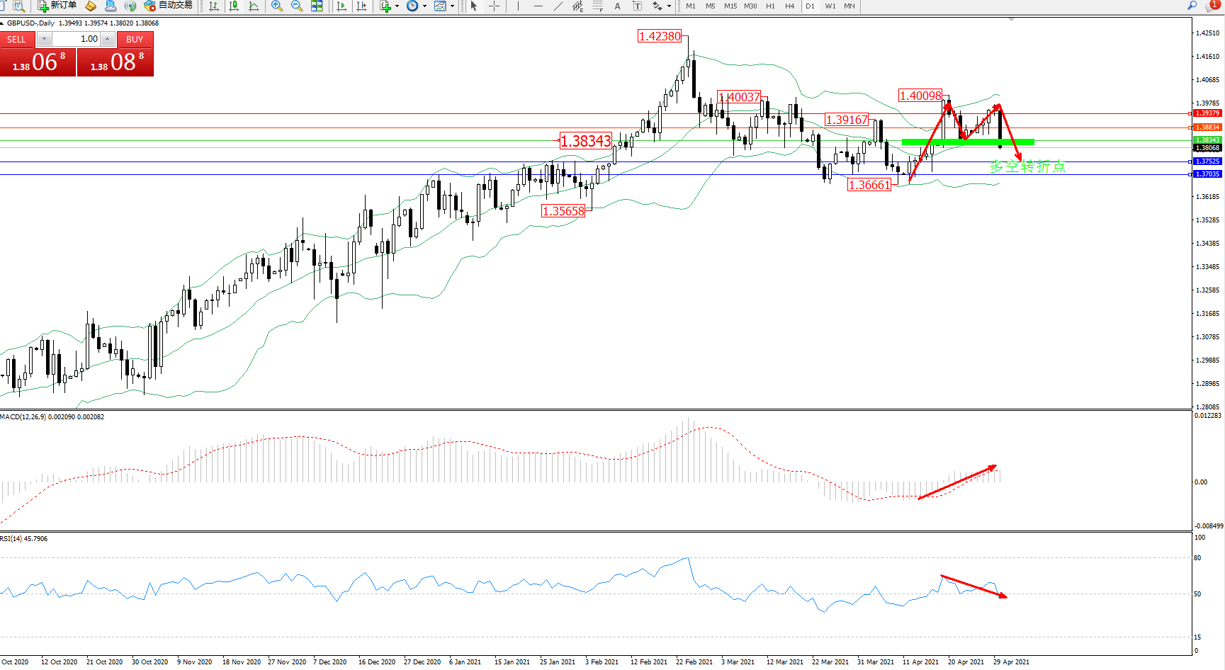 技术点评:低位多头动力延续布林带指标通道中上轨区间持续震荡上扬,高位触及1.40098位置后遇阻回撤,多头动力持续向上移动,但高位压制依旧存在,整体上移动能后续不足,空头急速入场,跌破中轨进入中下轨区间震荡中,MACD指标处于0轴线上方维持整理平移中,RSI指标处于50均衡线附近维持震荡后开始下行;