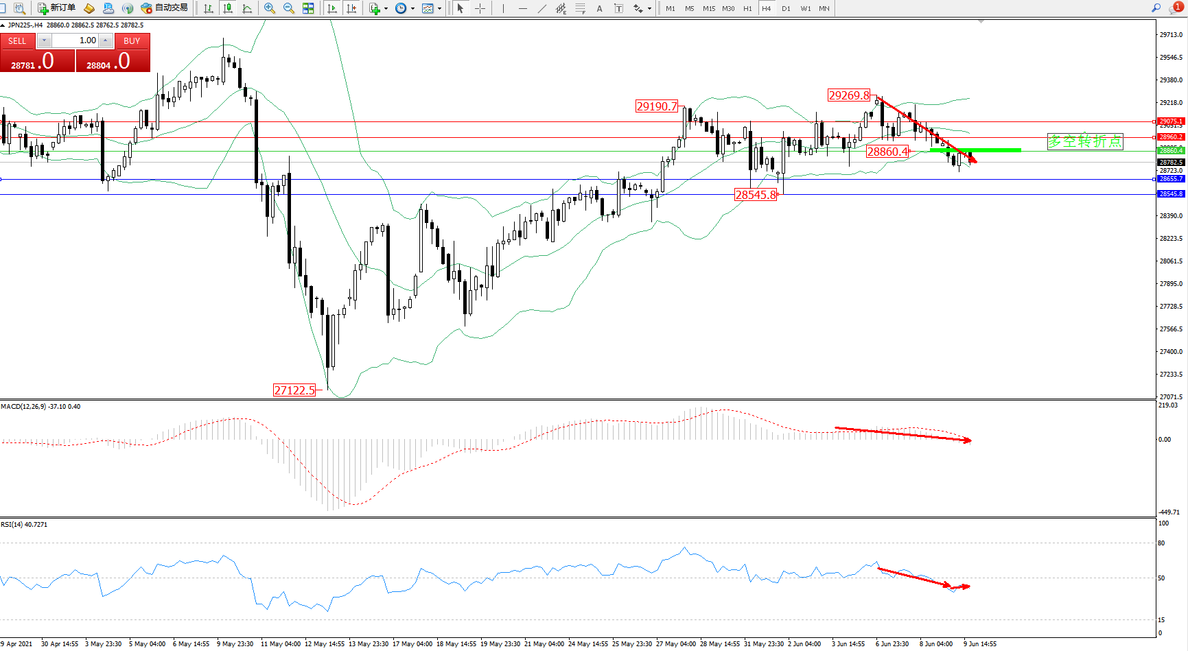 日经指数JPN225——4小时K线图显示: