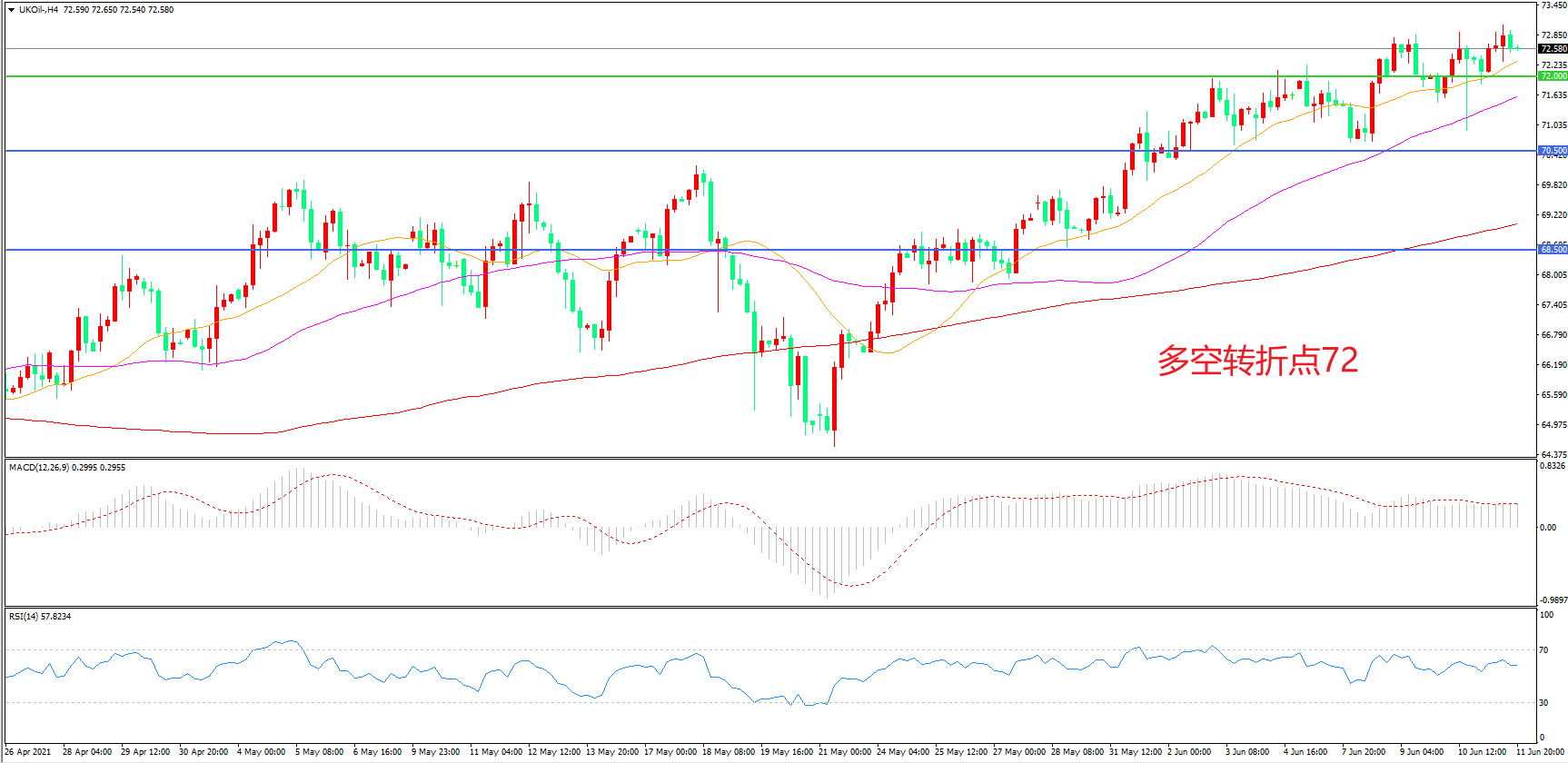 4小时图看,油价延续冲高态势,整体表现较强,72美元成为短期多空分水岭,MACD红柱增加,均线系统呈多头排列,日内延续上行概率较大。