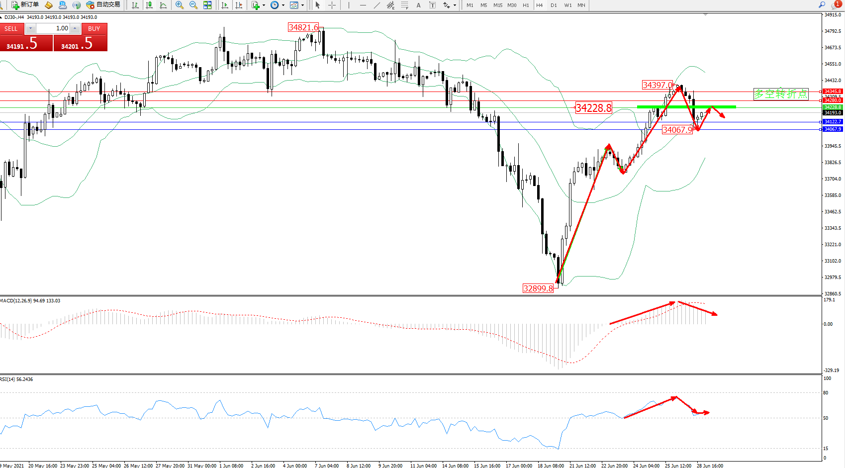 道琼斯指数DJ30——4小时K线图显示: