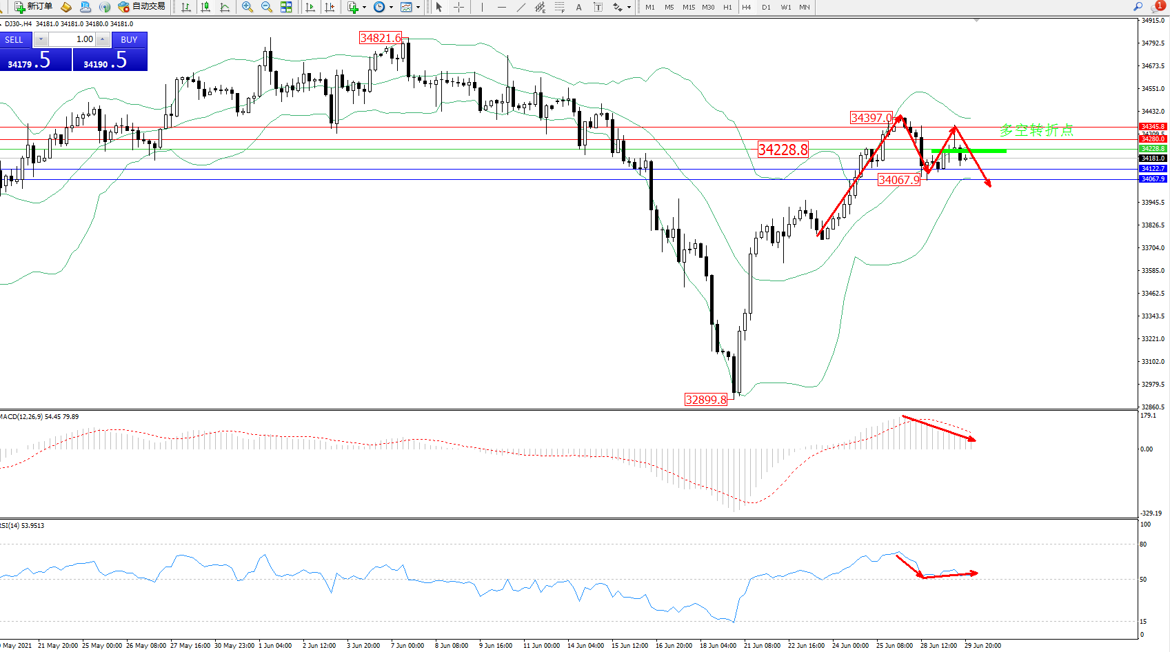 道琼斯指数DJ30——4小时K线图显示: