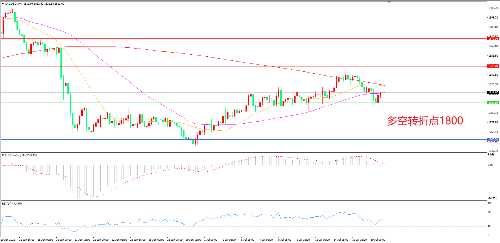 交易策略:  在1800.00之上看涨,目标1840.00        1870.00
