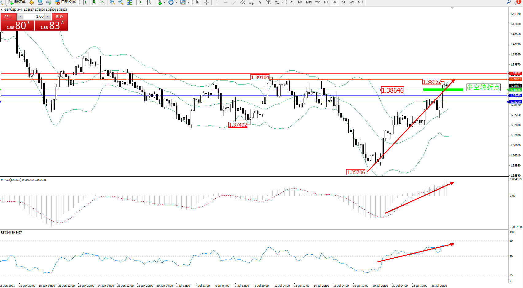 技术点评:多头动力延续布林带指标通道中上轨区间持续震荡上扬,高位抵达1.38952位置附近开始整理,多头动力有继续攀升态势,布林带指标呈上行趋势通道上扬后有缓慢张口走势迹象,MACD指标处于多头区域持续拉升中,RSI指标处于多头区域维持震荡中;