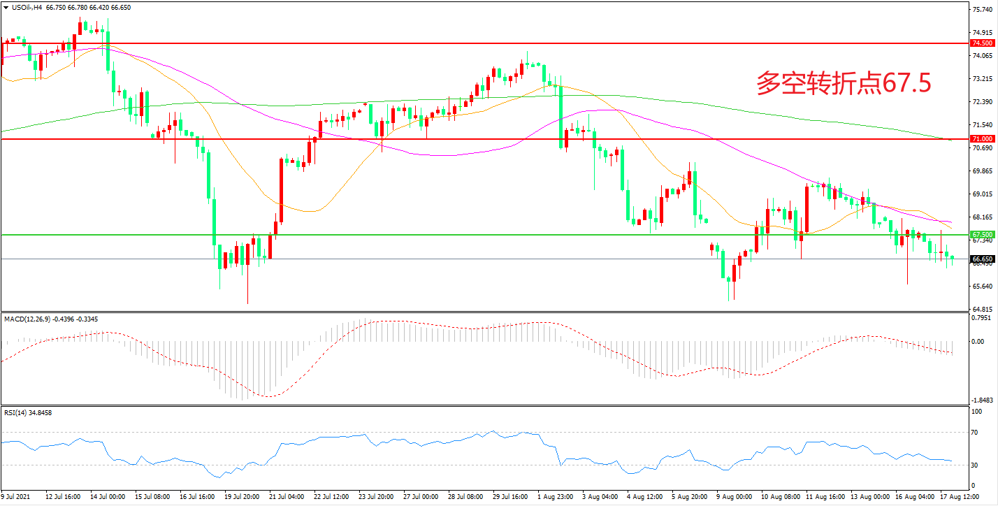 4小时图看,油价受制于均线系统的阻力逐阶下行,67.5成为短期多空分水岭, MACD绿柱增加,RSI指标走平,油价震荡下行概率较大。
