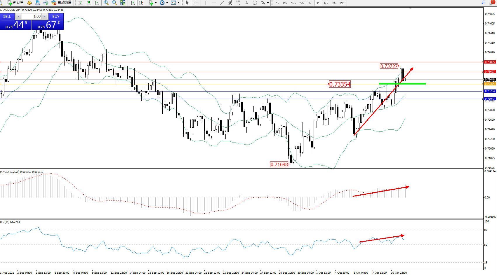 交易策略:0.73354上方看涨,目标0.73204、0.73047