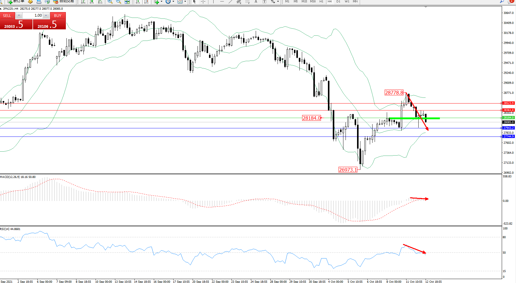 日经指数JPN225——4小时K线图显示:
