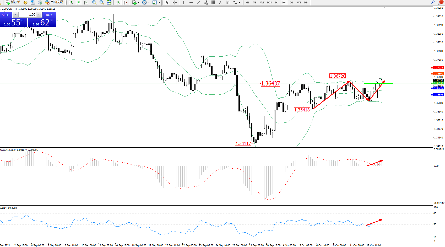 交易策略:1.36437上方看涨,目标1.36801、1.37034