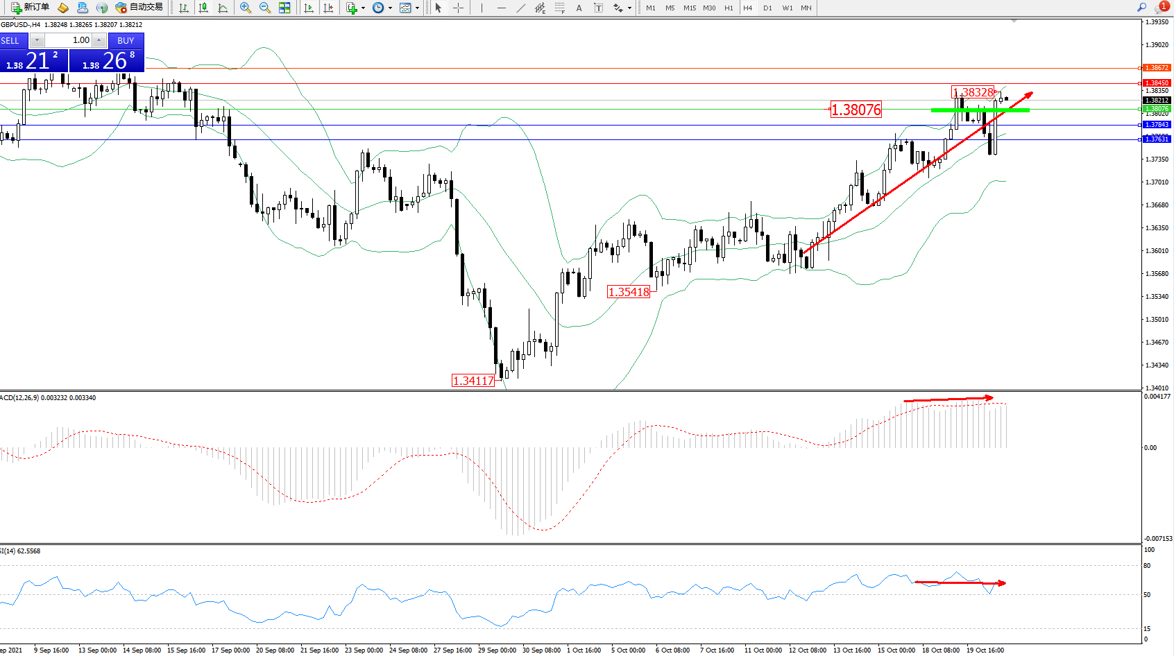 交易策略:1.38076上方看涨,目标1.38450、1.38672
