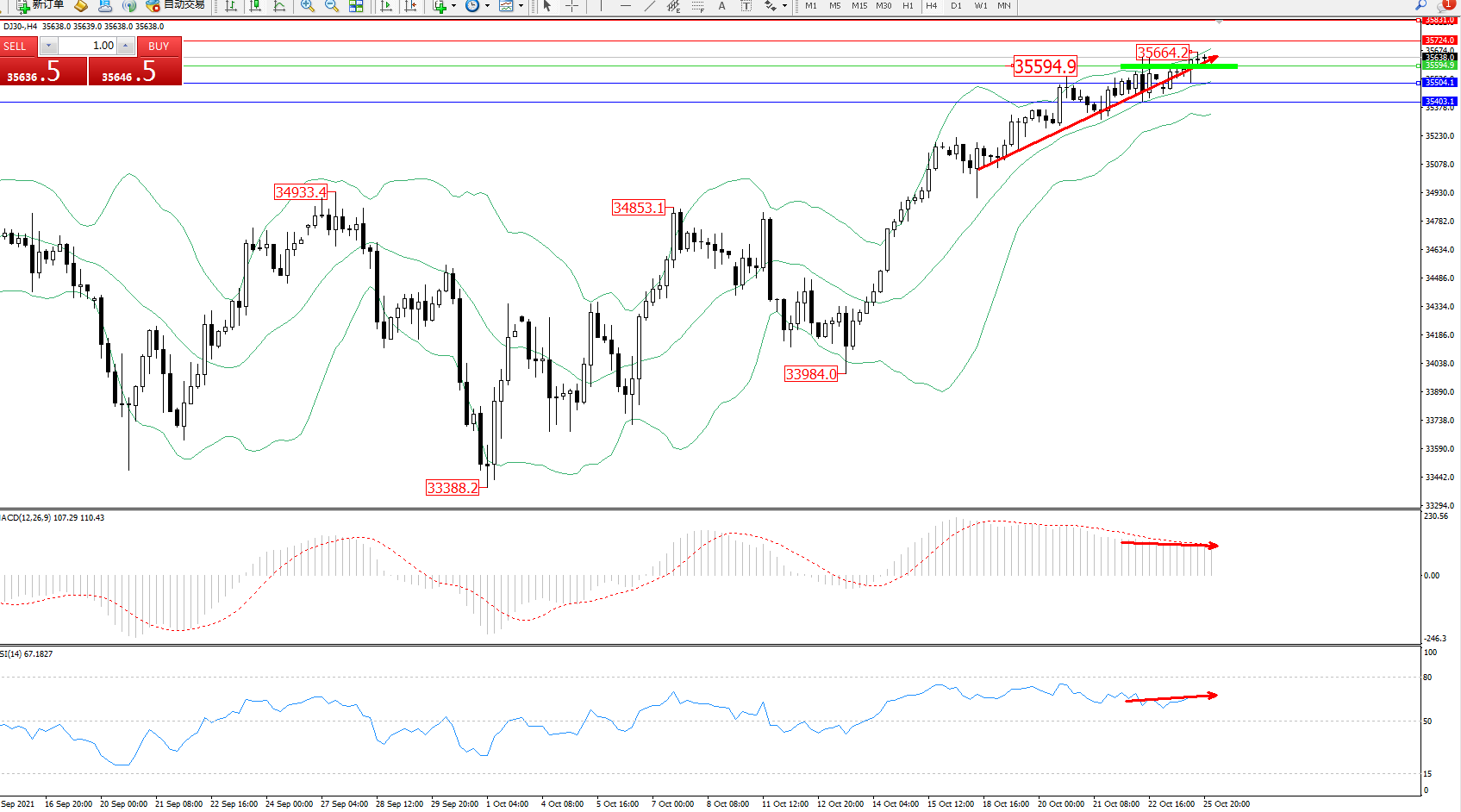 道琼斯指数DJ30——4小时K线图显示: