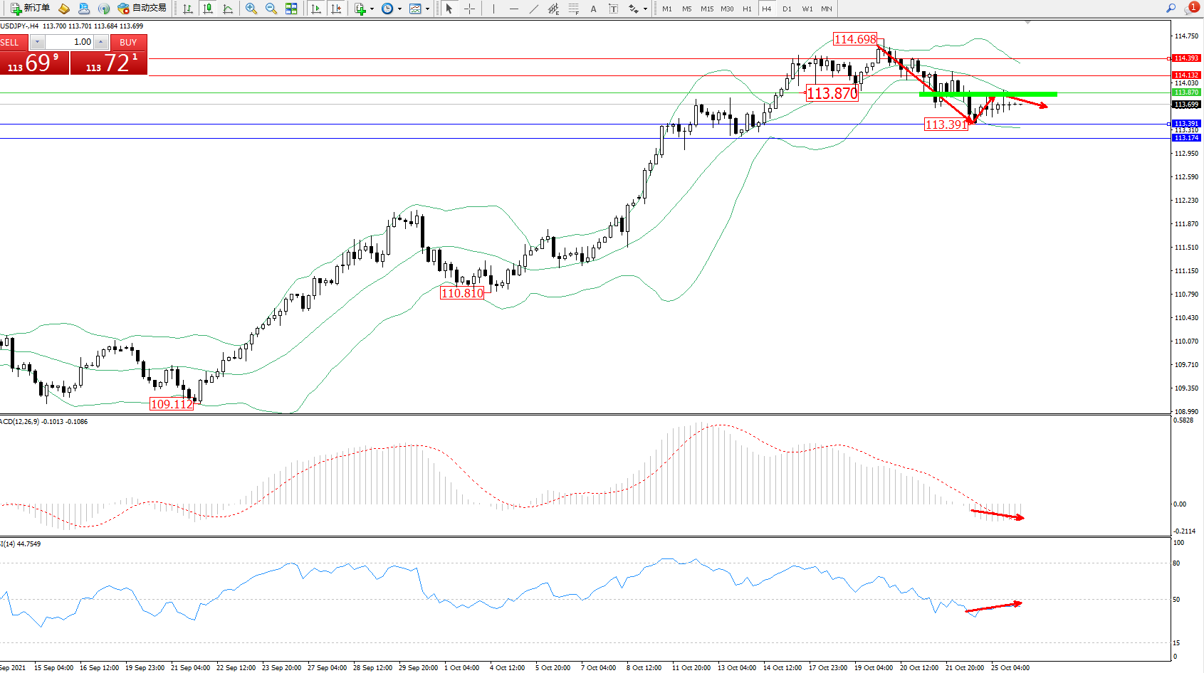 交易策略:113.870下方看跌,目标113.391、113.174