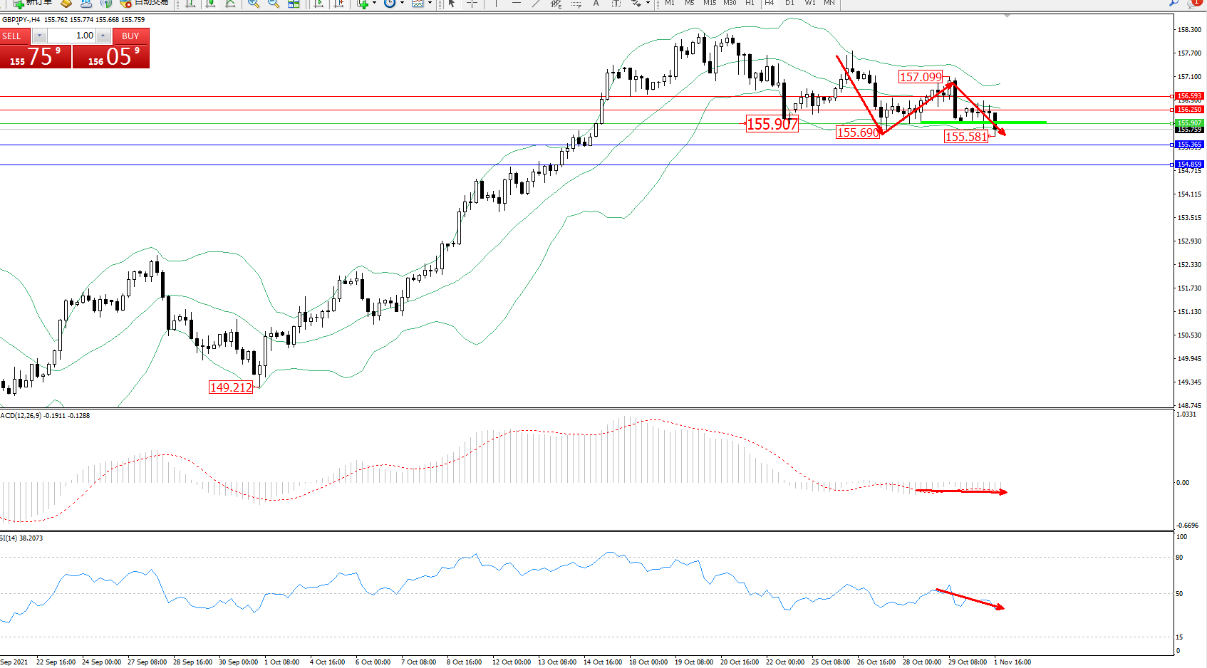 技术点评:高位空头动力延续布林带指标通道内维持窄幅整理向下移动,触及布林带指标下轨至155.581位置后开始整理,短期空头动力有进一步向下移动态势,布林带指标呈缓慢收口走势后有即将张口迹象,MACD指标处于0轴线下侧弱势徘徊中,RSI指标处于50均衡线下方持续窄幅整理向下移动;