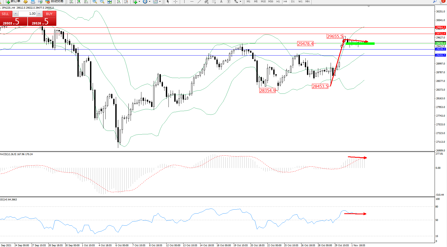 日经指数JPN225——4小时K线图显示: