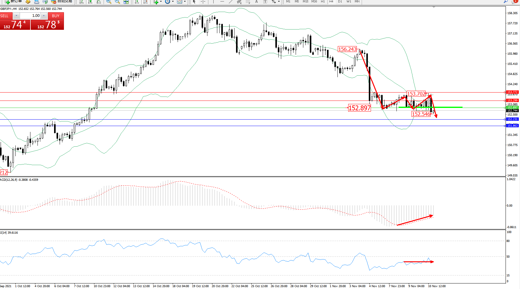备选策略:152.897上方看涨,目标153.299、153.772
