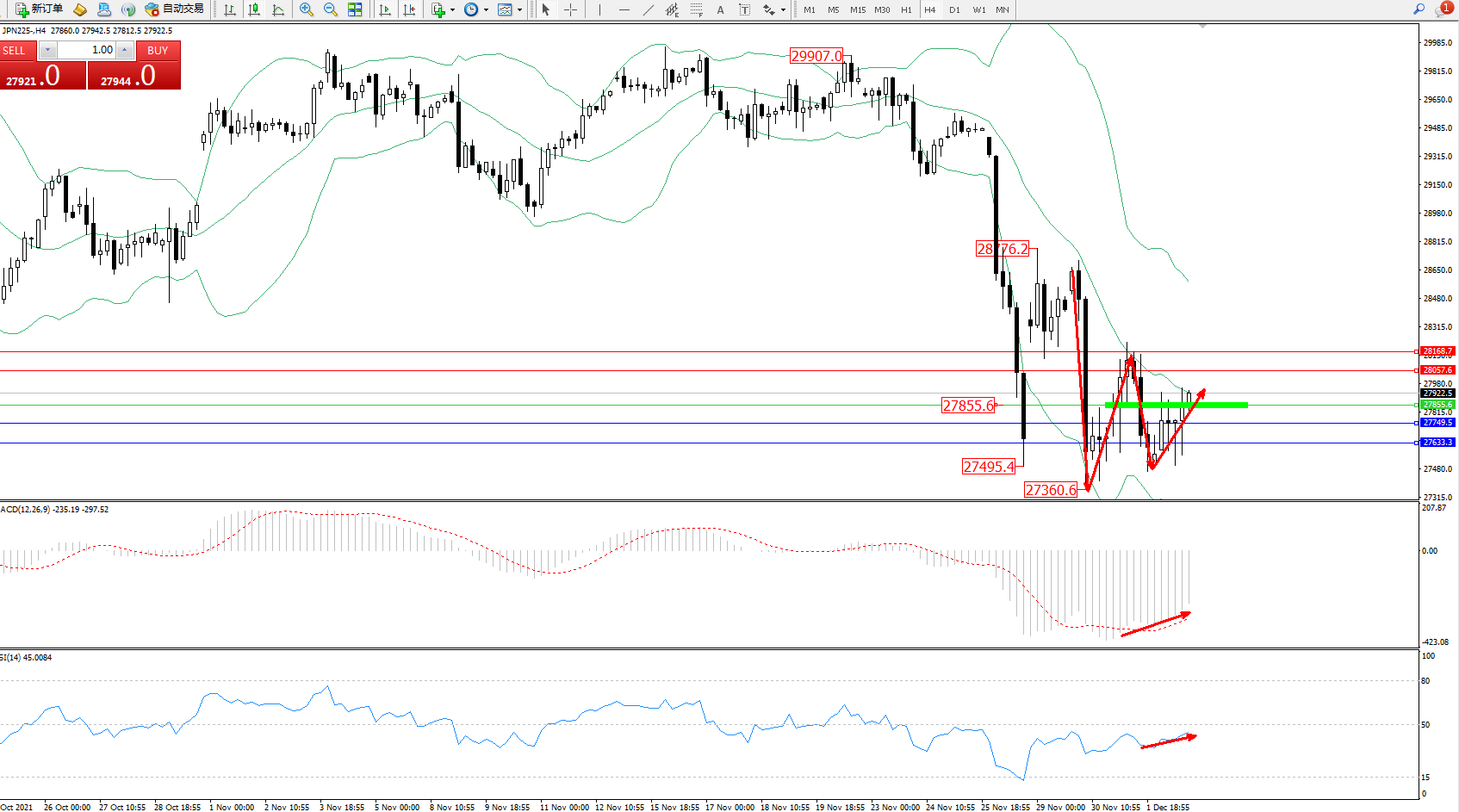 日经指数JPN225——4小时K线图显示: