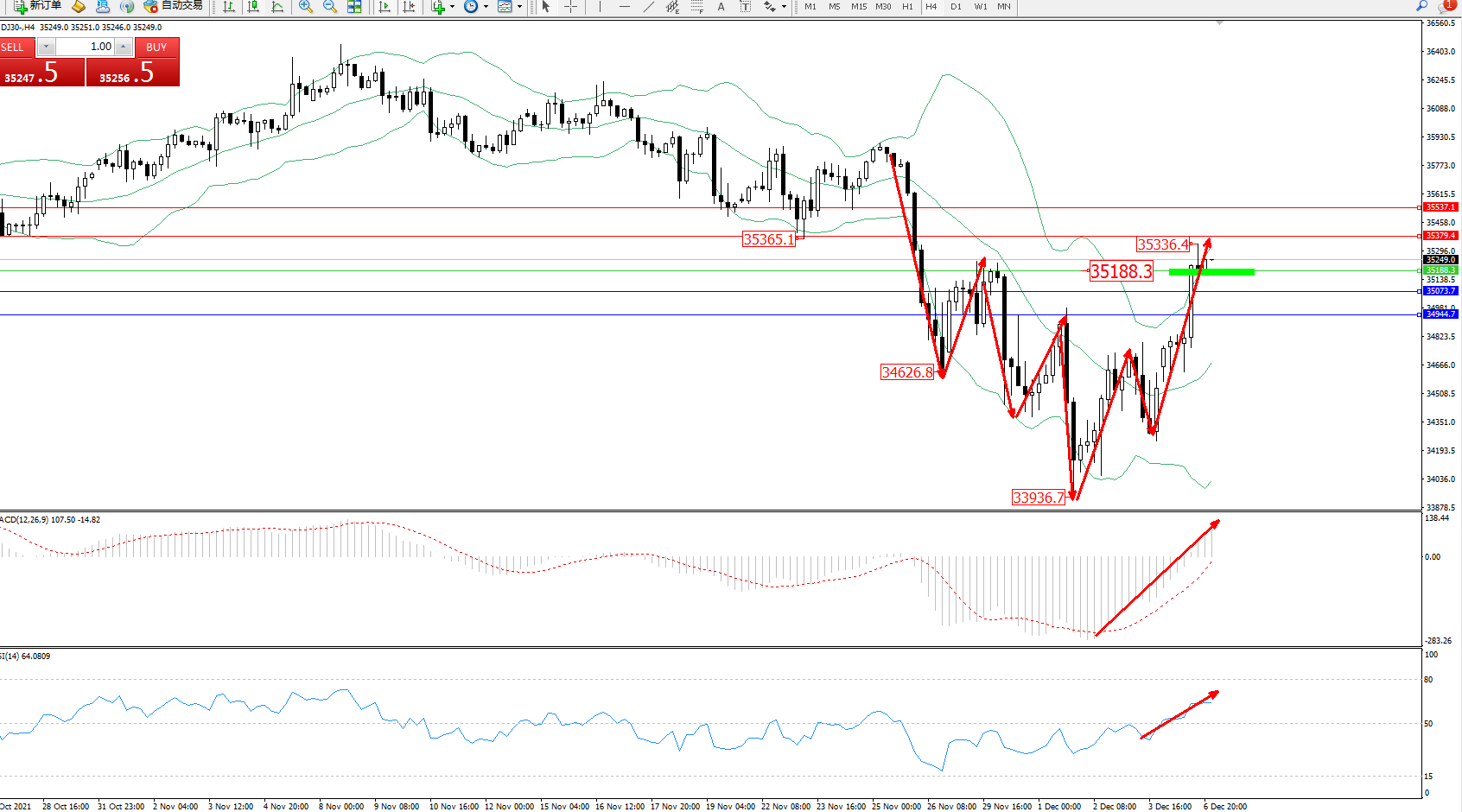 道琼斯指数DJ30——4小时K线图显示: