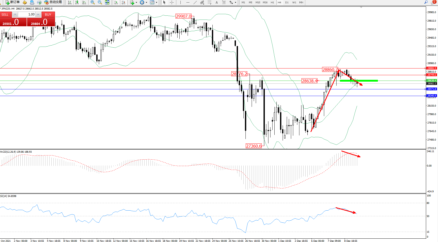 日经指数JPN225——4小时K线图显示: