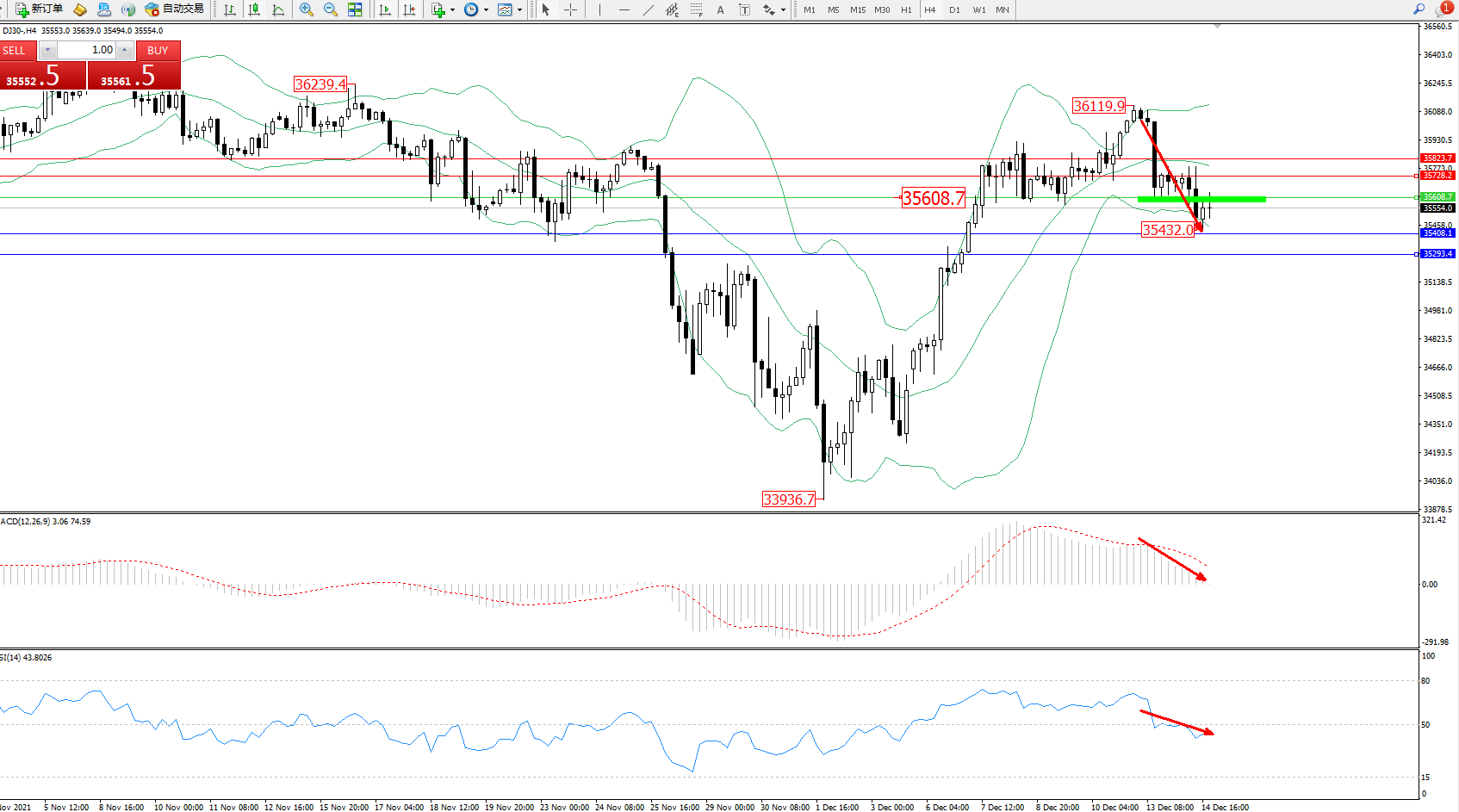 道琼斯指数DJ30——4小时K线图显示: