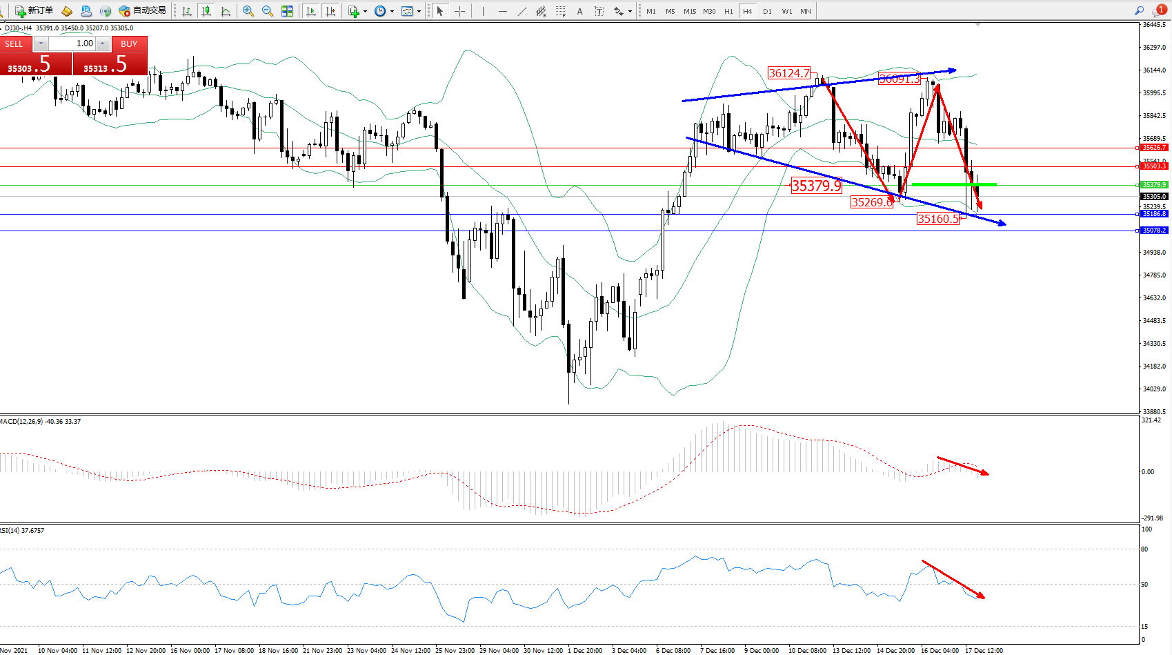 道琼斯指数DJ30——4小时K线图显示: