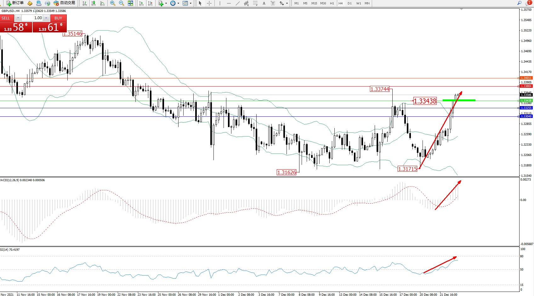 交易策略:1.33438上方看涨,目标1.33804、1.34011